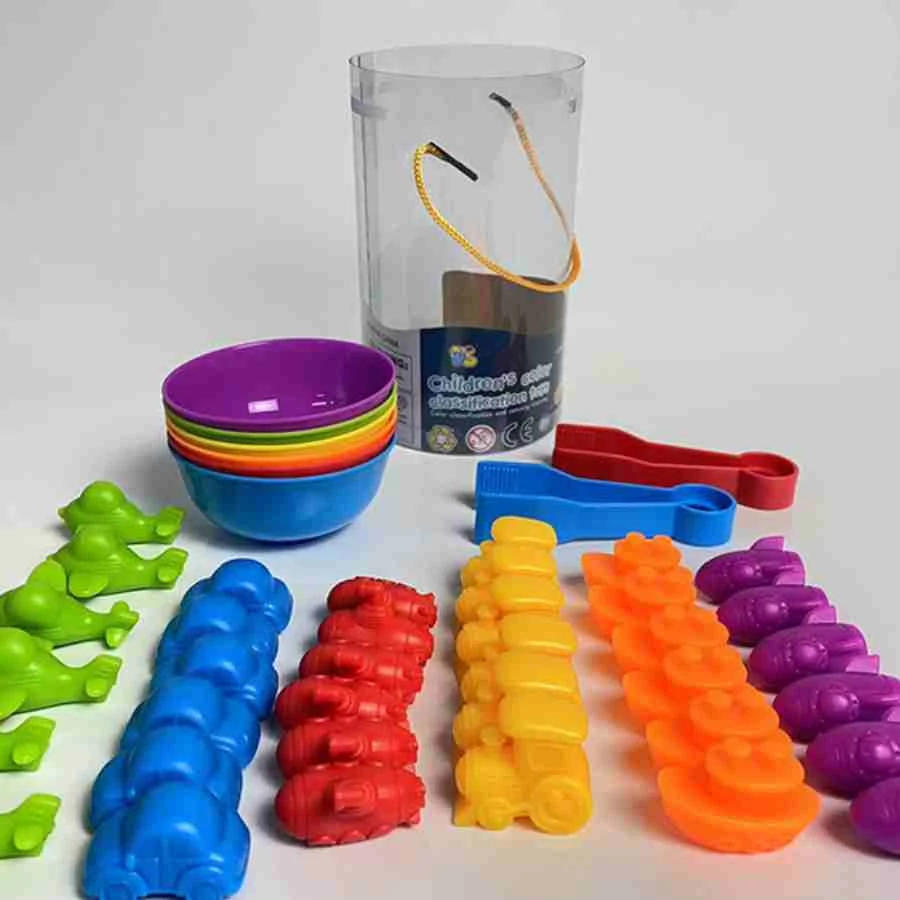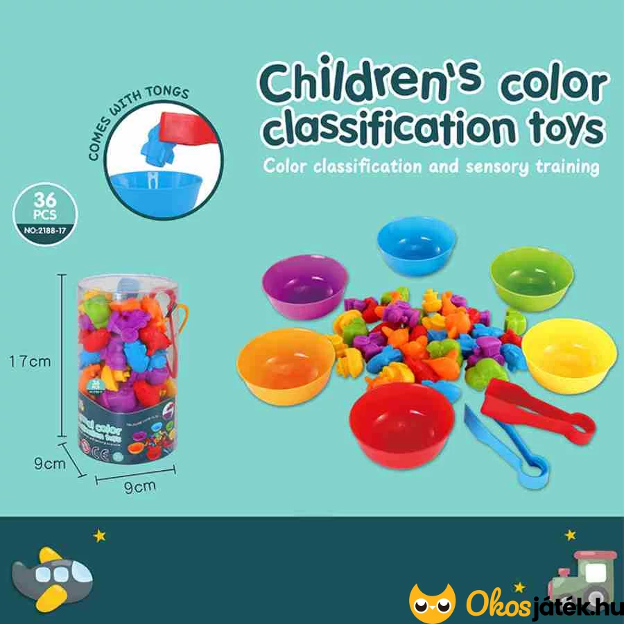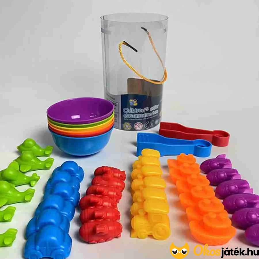 A Szortírozó készlet – Járművek változatos játéklehetőségeket kínál, amelyek során a gyerekek járműformák és színek szerint válogathatnak különféle figurákat a hozzá tartozó tálkákba. A csipesz használata segíti a kézügyesség fejlődését, miközben a válogatás figyelmet és pontos mozdulatokat igényel.