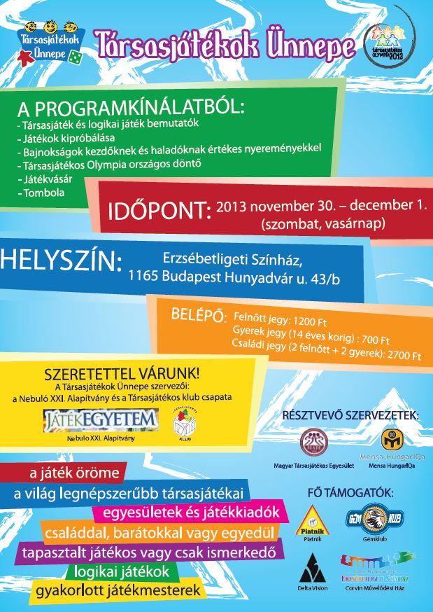 A Társasjátékok Ünnepe 2013-ban november 30-án és december 1-én (szombat - vasárnap) kerül megrendezésre a Corvin Művelődési Házban, ezúttal a gyönyörű Erzsébetligeti Színház Nagytermében. Több mint száz asztalon lesz lehetőség kipróbálni a legjobb magyar és külföldi logikai, taktikai, stratégiai és családi társasjátékokat. Számos szervezet, egyesület és játékkiadó vesz részt az eseményen, ahol hozzáértő játékmesterek segítenek eligazodni a több száz társasjáték között. Így mindenki megtalálhatja a neki való játékot, akár családdal, barátokkal vagy egyedül érkezik, tapasztalt játékos vagy csak most ismerkedik (újra) a társasjátékok világával. Tavaly 300 versenyző és érdeklődő vett részt az eseményen, de idén a lényegesen nagyobb helyszínen ennek többszöröse várható.