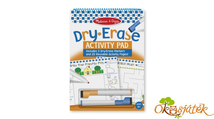 Letörölhető lapok foglalkoztató füzet Melissa and Doug – néhány feladat a 20 közül: pontösszekötés, labirintus játék, amőba, arc megrajzolása, forma átrajzolás stb…
