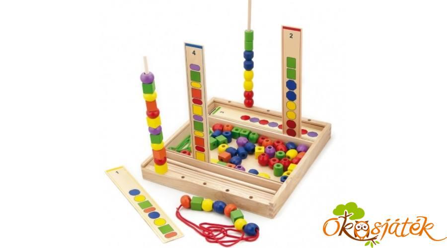 Sorrendállítás- a Viga golyós sorritmus játékban mintamásolás történik, amikor is a gyermeknek a mintalapon látottakat kell reprodukálnia. Az elem színét és formáját látja, annak megfelelően kell a fagyöngyöket rátennie egy felállított rúdra. Melyik az első, mi jön utána, mi van a zöld fölött, mi van a sárga alatt? ilyen és ehhez hasonló kérdéseket tehetünk fel a gyermeknek.