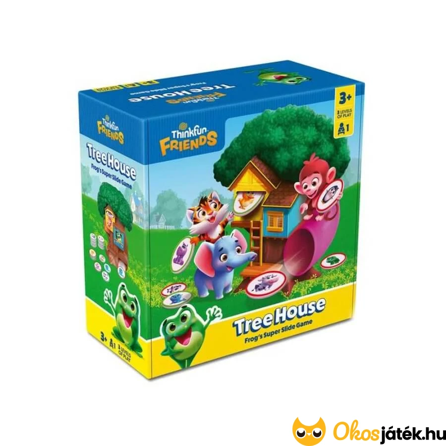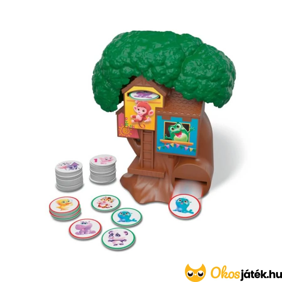 A 3 dimenziós lombház réseibe dobálhatják a gyerekek az állatos, a számos, és a színekkel és formákkal díszített korongokat.