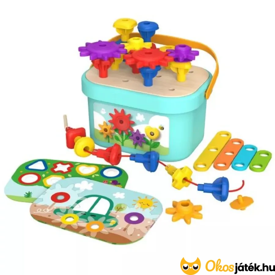 A különleges építőkészlet színes műanyag és fa elemeket tartalmaz, amelyekből a gyerekek végtelen variációban hozhatnak létre saját alkotásokat. A forgó kerekek és fogaskerekek izgalmas mechanikai játékélményt adnak, miközben a virágok és más dekoratív elemek segítségével egy vidám, saját készítésű kertet is kialakíthatnak.