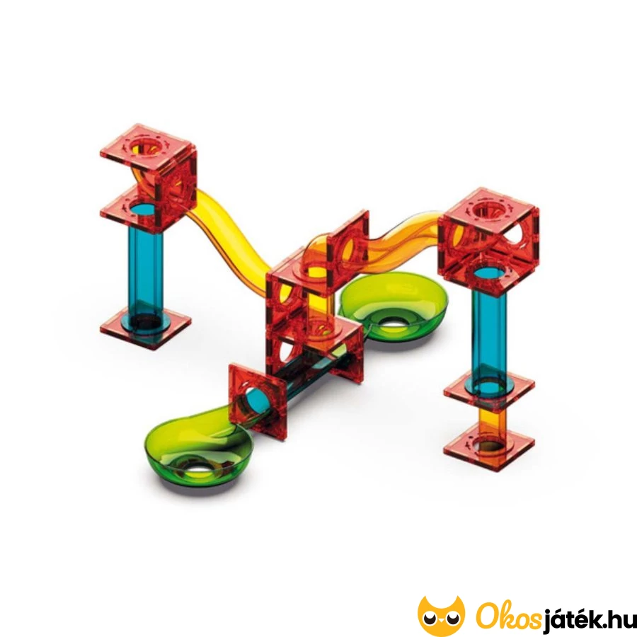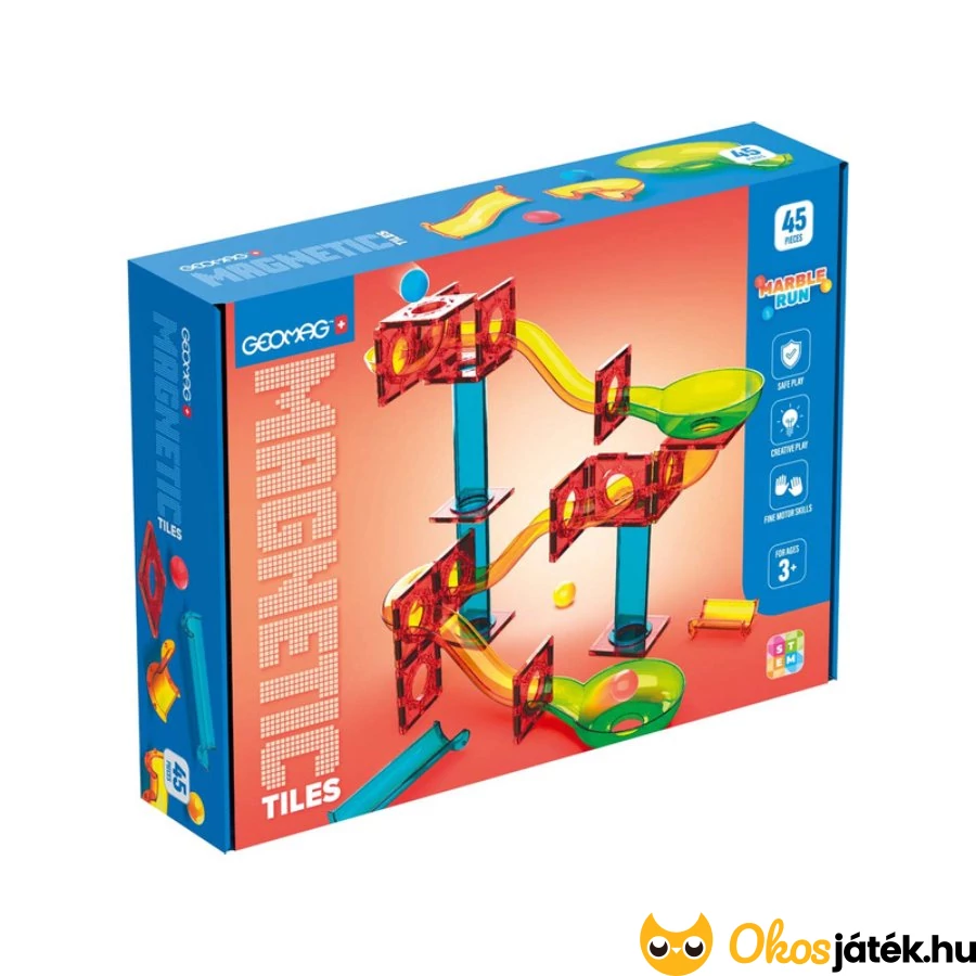 A Geomag Magnetic Tiles Marble Run a mágneses lapkák és a golyópálya-építés izgalmas kombinációja. A gyerekek átlátszó lapokból és csúszdaszerű elemekből állíthatnak össze változatos pályákat. A mágneseknek köszönhetően az elemek stabilan összekapcsolódnak, így a golyók gördülése zökkenőmentes.