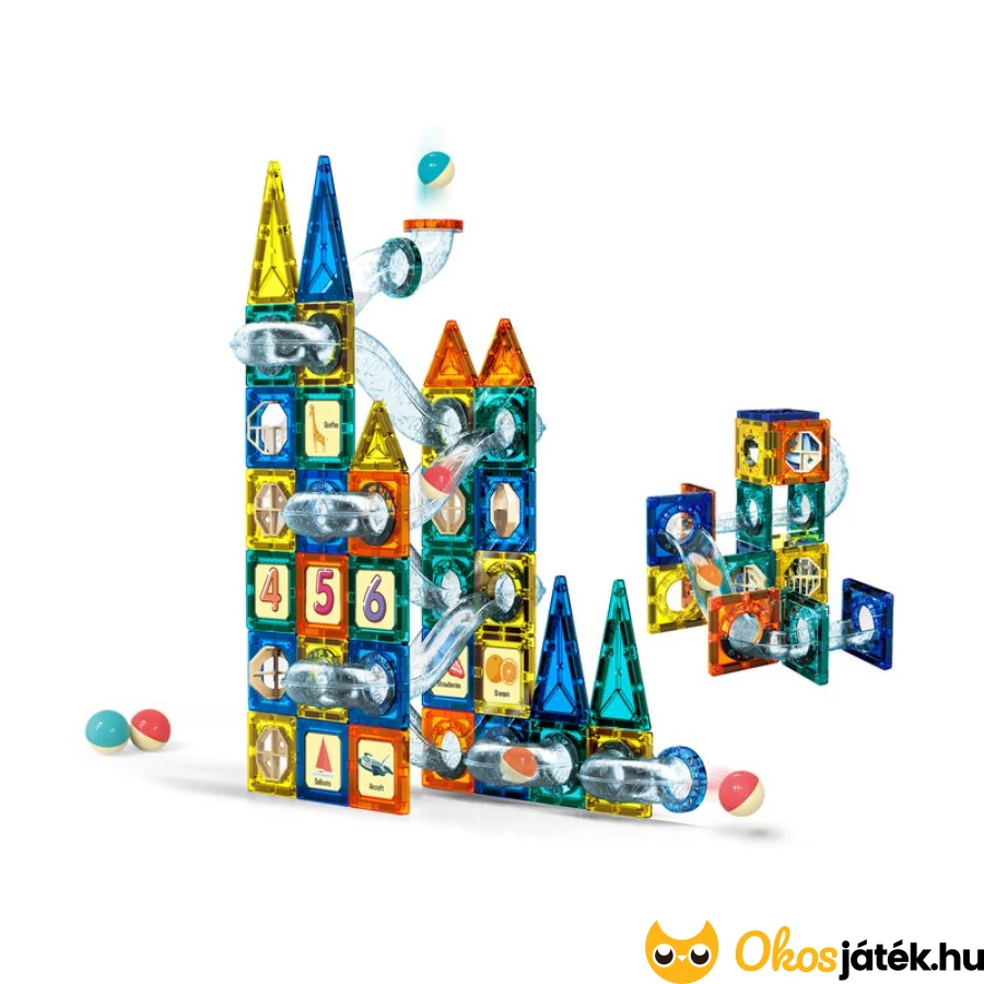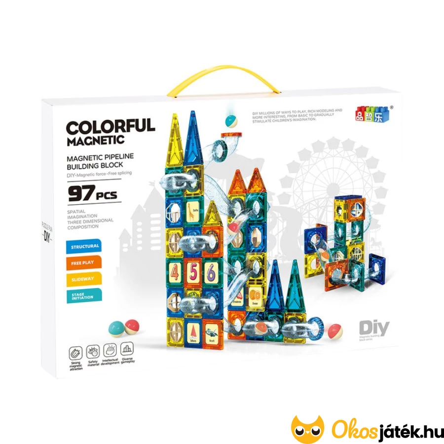 97 darabos mágneses építőjáték készlet, mellyel golyópályákat is lehet készíteni. A műanyag elemek oldalai mágnesezettek, így könnyű őket összeilleszteni.