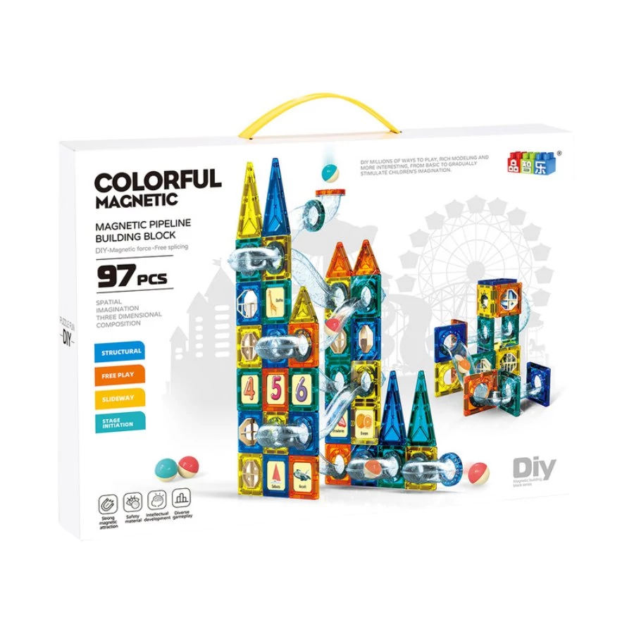 Különleges mágneses építőjáték, hiszen nemcsak különféle épületeket, építményeket tudnak a gyerekek alkotni, hanem golyópályákat is, a készlethez tartozó golyóknak, golyópályás elemeknek, íveknek köszönhetően. Az alkotásnak csak a képzelet szabhat határt.
