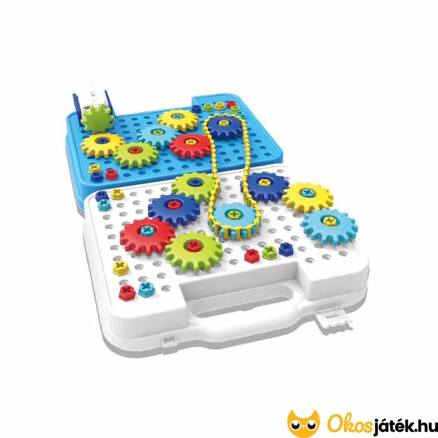 A szétnyitható bőrönd belseje lyukacsos. A fogaskerekeket csavarokkal lehet rögzíteni az alapra. A cél, hogy minél több fogaskereket bekapcsoljon a gyermek a rendszerbe. A játék közben fejlődik a kézügyesség, a logikai gondolkodás és a problémamegoldó képesség, miközben a kicsik rengeteget tanulnak a mozgás és az erőátvitel alapelveiről.