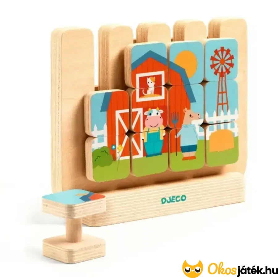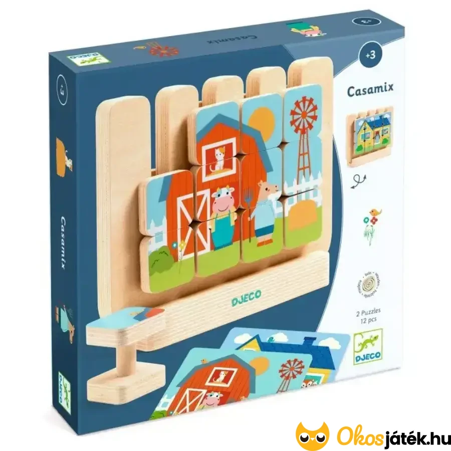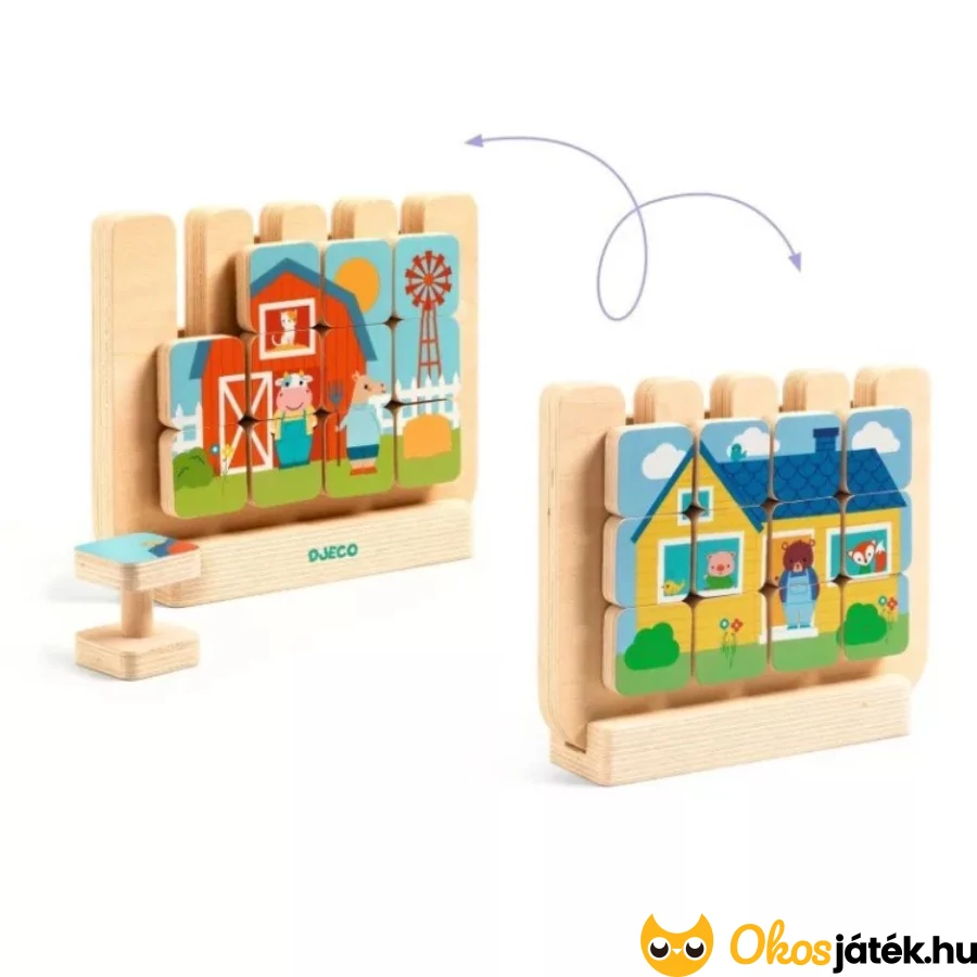 Különleges képkirakó fejlesztő fajáték 3 éves kortól. A játékban kétoldalas fa elemeket találunk, amiket egy függőleges alapba kell behelyezni úgy, hogy a 12 darabkából mindkét oldalon összeálljon a ház és a pajta képe.
