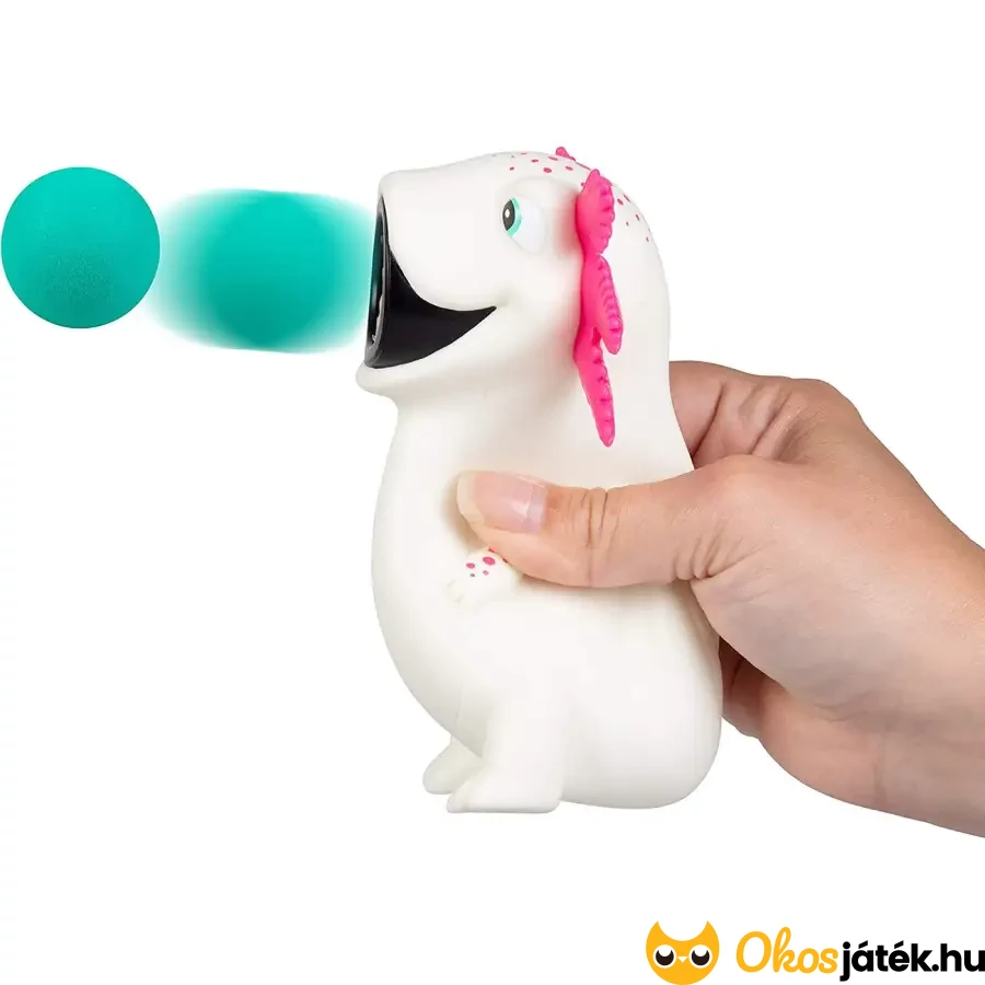 A figura szájába helyezett hablabdát egy egyszerű nyomással lehet kilőni. Minél erősebben nyomjuk össze a figurát, annál messzebb repül a labda.