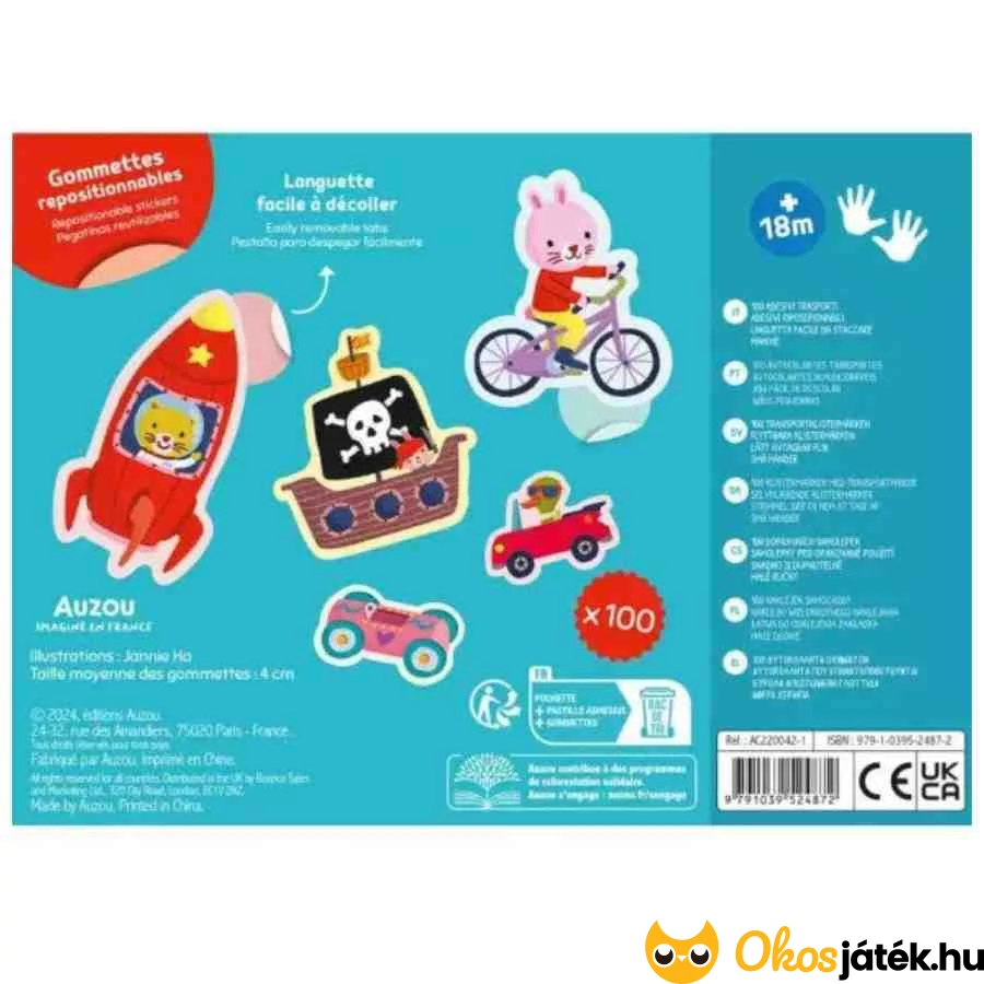 Az Auzou 100 darabos matrica készlete kifejezetten az apró kezekhez készült: a matricák mérete pont ideális, ráadásul egy kis lehúzófül is segíti a használatukat, így a gyerekek önállóan, sikerélménnyel játszhatnak velük.