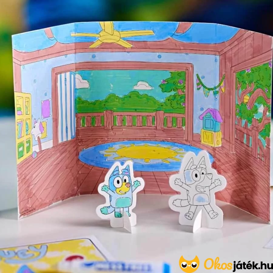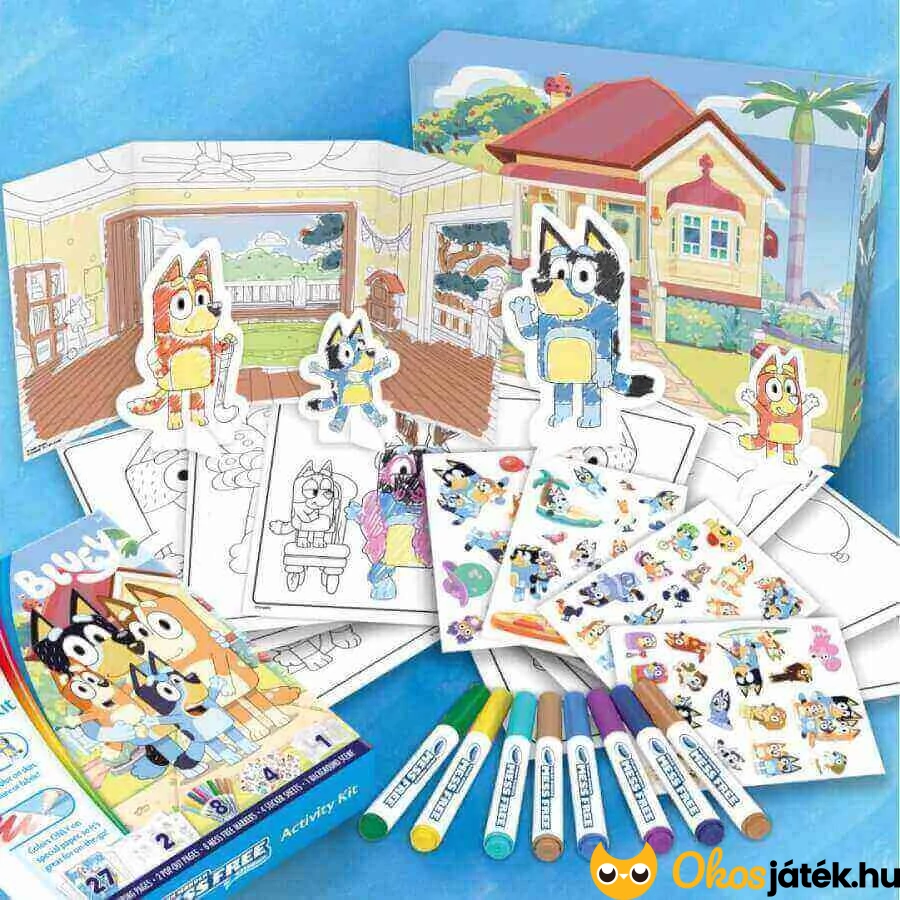 Ezzel a kompakt készlettel 27 Bluey-t és barátait ábrázoló színezőképet tudnak kifesteni a gyerekek. A 8 különböző színű filctollal élénk színekbe öltöztethetik a mese szereplőit kislányok és fiúk egyaránt.. Az elkészült rajzokat Bluey mesefigurás matricákkal díszíthetik ki a gyerekek.