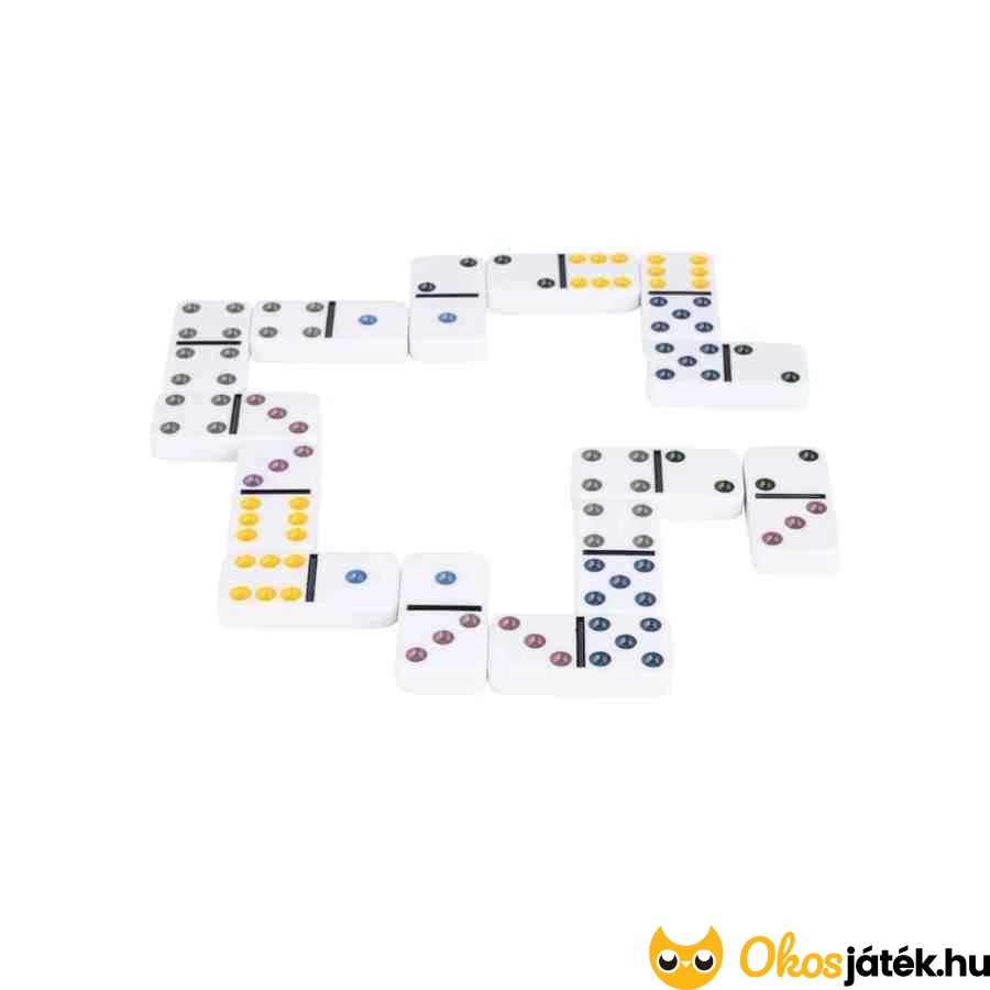 A készlet 28 darab tartós anyagból készült dominót tartalmaz, színes pontokkal a gyors azonosítás és a kellemesebb játékélmény érdekében.