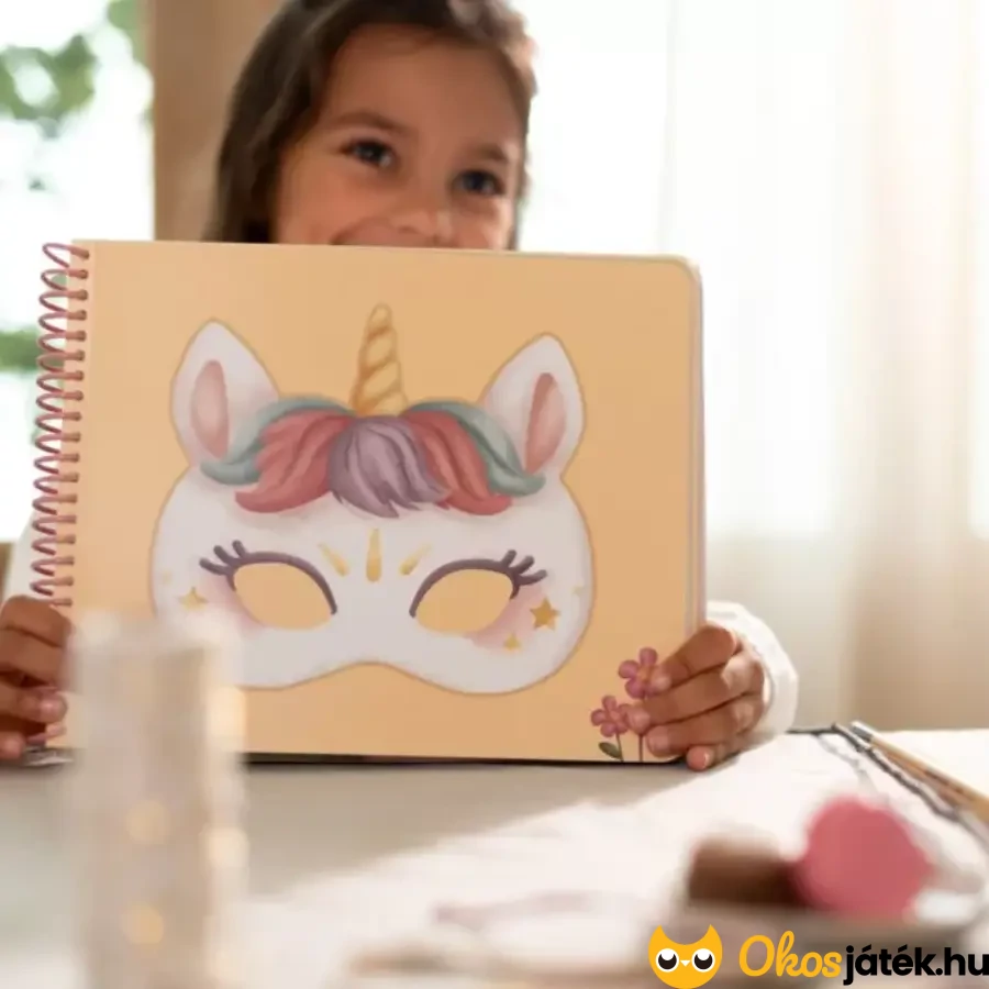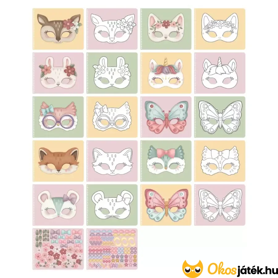 Pillangós, rókás, őzikés, baglyos, sőt, akár unikornisos álarcot is lehet készíteni, ráadásul több mint 200 matricát lehet felhasználni az alkotáshoz. A fekete-fehér képek tetszés szerint kiszínezhetők, ezáltal egyedi maszkokat lehet létrehozni. A lapok erősebb papírból készültek, így könnyebben lehet őket vágni.