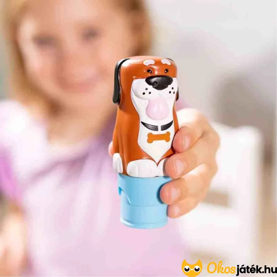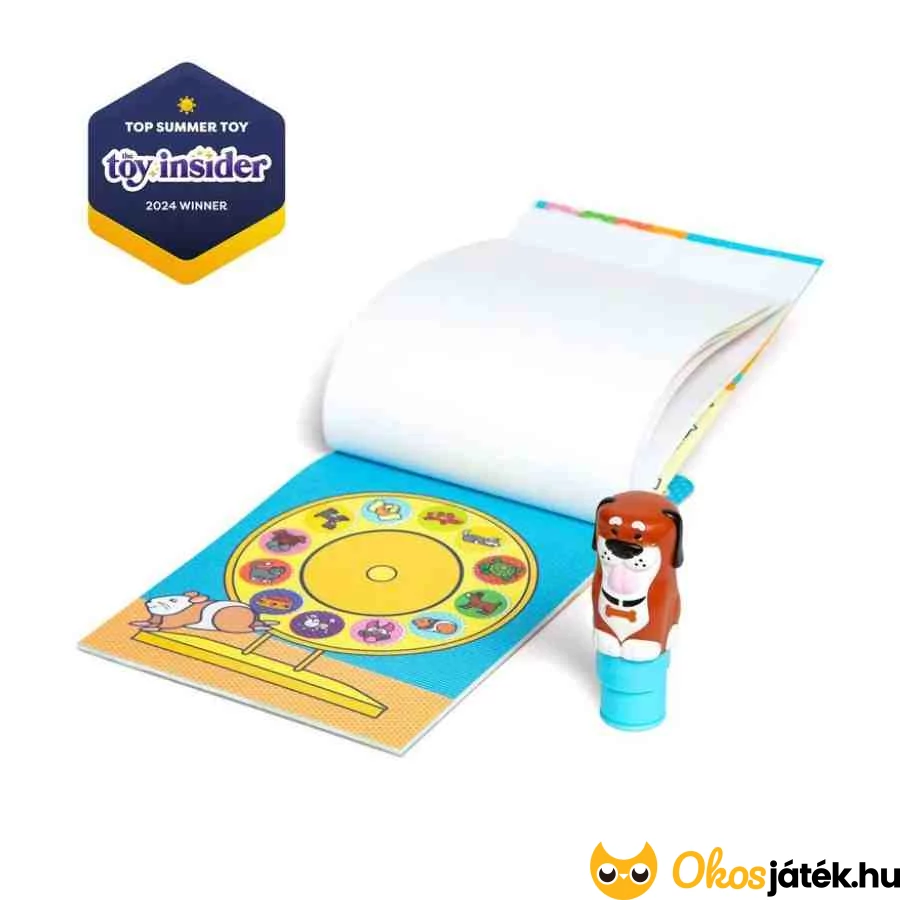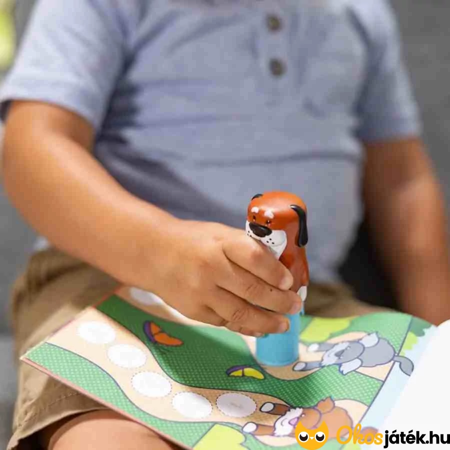 A betöltős matricázó teljesen új élményt nyújt a matricázásban, hiszen nem kell felszedni a matricákat a lapról, hanem egy adagolóba töltve használhatják a gyerekek. A kutyás pecsételő végigkísér a 24 oldalas, szórakoztató, állatos feladatokon, amelyek között számolás, párosítás és keresős feladatok is vannak.