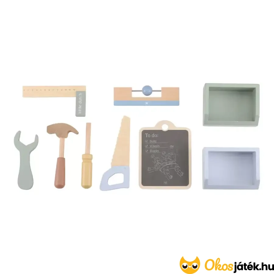 Stabil, pasztellszínű munkapad rengeteg kiegészítővel a Little Dutch játékgyártótól, mellyel a gyerekek elmerülhetnek a barkácsolás és alkotás világában.