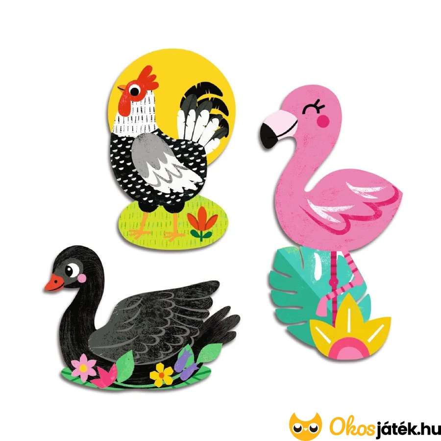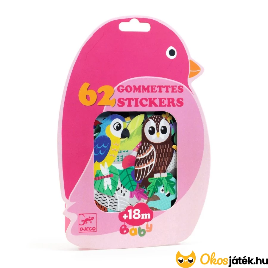 Madaras matrica készlet nagyméretű matricákkal, aranyos madárka formájú csomagolásban a Djeco játékgyártótól kimondottan kisebbeknek, másfél éves kortól. A szett 62 darab madarat ábrázoló matricát tartalmaz.