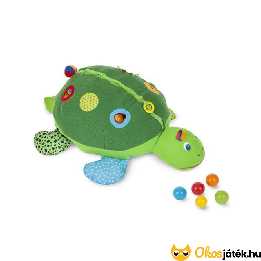 A gyerekek imádni fogják ezt a zörgő, csilingelő, sokféle anyagból készült óriás plüss játékot. A hatalmas, barátságos teknős 60 darab, színes, puha labdával van megtöltve, amelyeket könnyű megfogni, eldobni és gurítani. A labdák megfogása, gurítása és dobálása kiválóan fejleszti a finommotoros készségeket és a szem-kéz koordinációt.