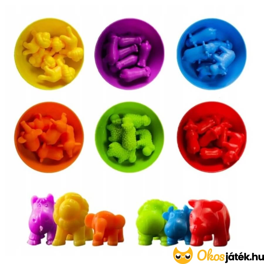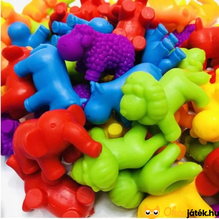- 36 db figura: 6 különböző fajtájú/formájú állat, 6 különböző színben: piros, narancssárga, zöld, citromsárga, kék, lila