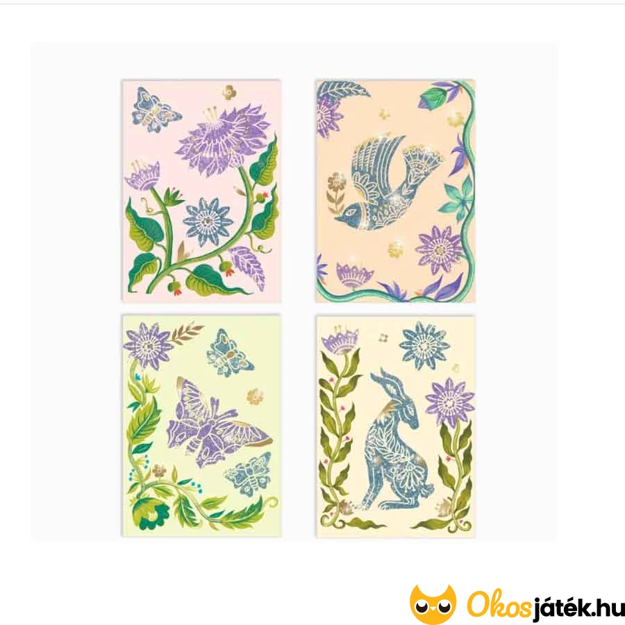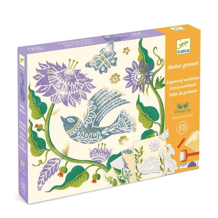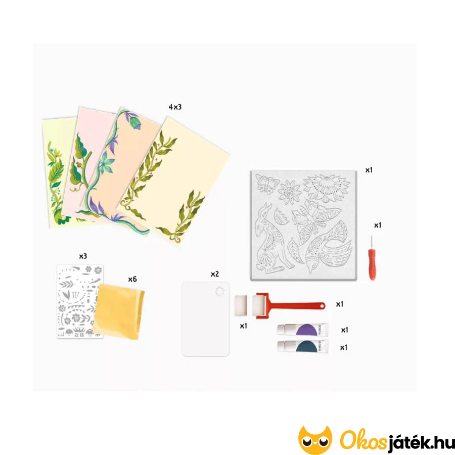 Gyönyörű és különleges kreatív Djeco készlet, melyben a gravírozás, nyomatkészítés világával ismerkedhetnek meg a gyerekek. Bélyegzőkkel, festőhenger és festék segítségével színes mintákat, nyomatokat  készíthetnek tetszés szerint dekorálva a kártyákat.