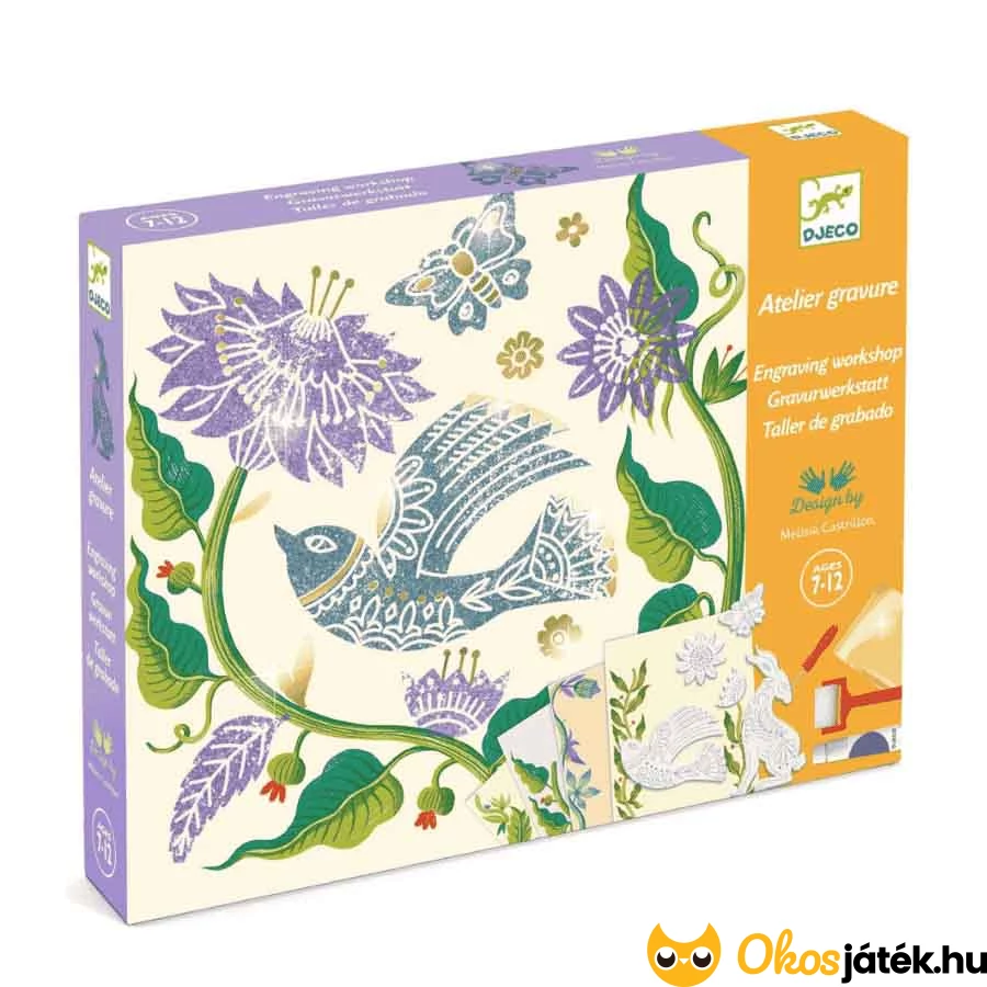 Ebben a nyomatkészítő kreatív Djeco készletben a mellékelt gravírozó eszközökkel a gyerekek különböző vonalakat, pontokat és formákat vájhatnak a polisztirol (műanyag, hungarocellhez hasonló) lapokba. Ezekből a műanyag lapokból lesznek a bélyegzők, melyeket a papírra lehet nyomni és mintázni velük. A műanyag lapokon állatok, virágok, a készlet nevét viselő golgota virág is megtalálható.