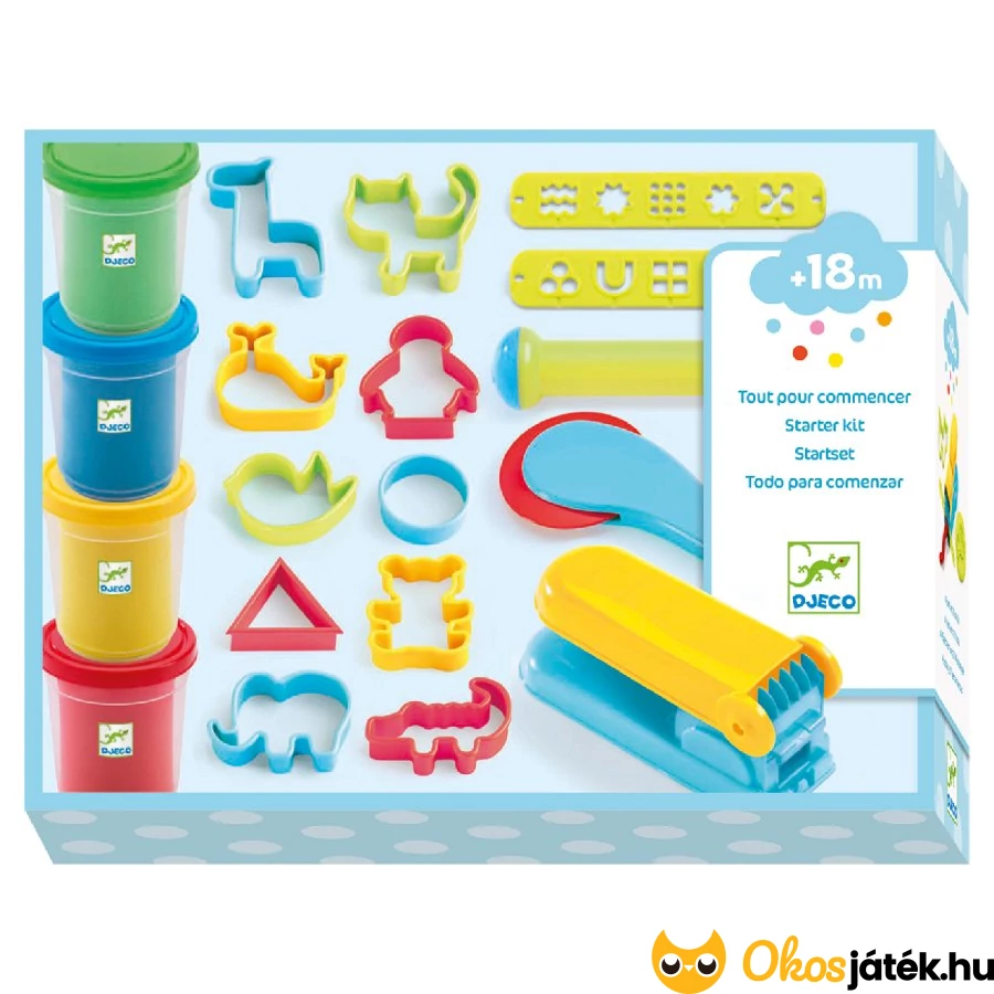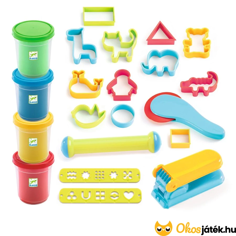 Djeco gyurmázós szett kisebbeknek. A 4 tégely puha Djeco gyurma mellett pizzaszeletelőt, sodrófát, állatos gyurmakiszúrókat, gyurma kinyomót is találunk.