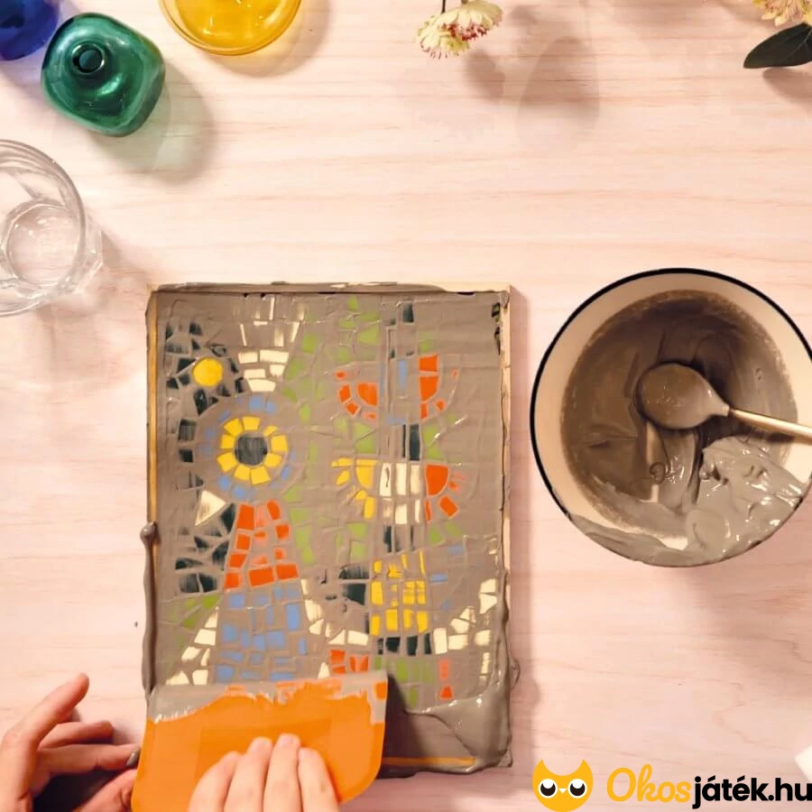 A készlet minden olyan anyagot és eszközt tartalmaz, amire csak szükséged lehet: kerámia mozaikdarabok, ragasztó, cement, mozaikfogó, fa alaplap és sablonok – mindez egy igényesen kialakított tárolódobozban érkezik. A doboz nemcsak praktikus, de stílusos is – akár újrahasznosítható kincsesládaként is használhatod.
