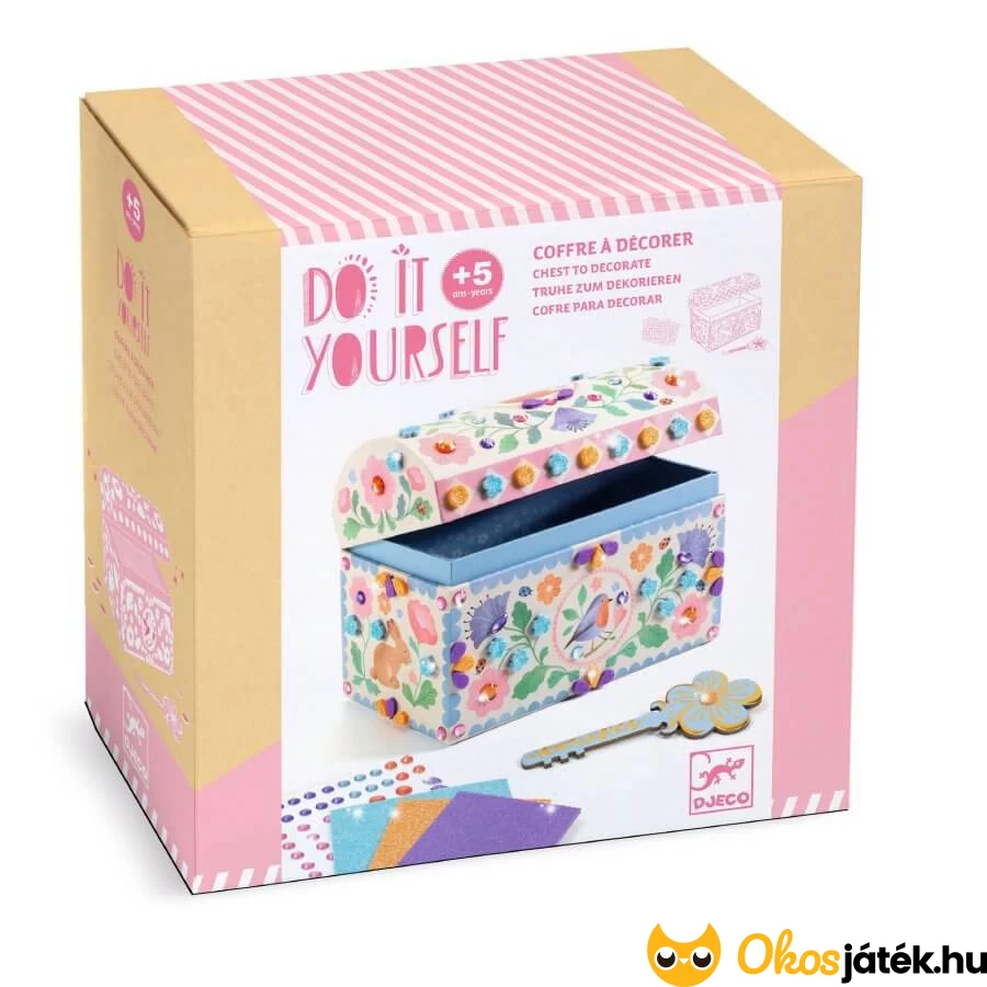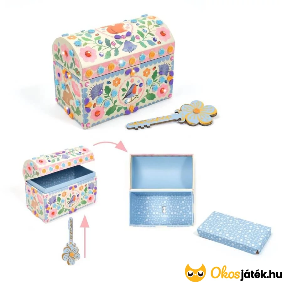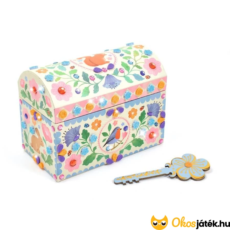 Varázslatos kincsesláda, melyet a lányok maguk díszíthetnek fel. A kemény kartonból készült ládika meseszép virágaira öntapadós strasszokat és mozaikdarabokat ragaszthatnak a gyerekek.