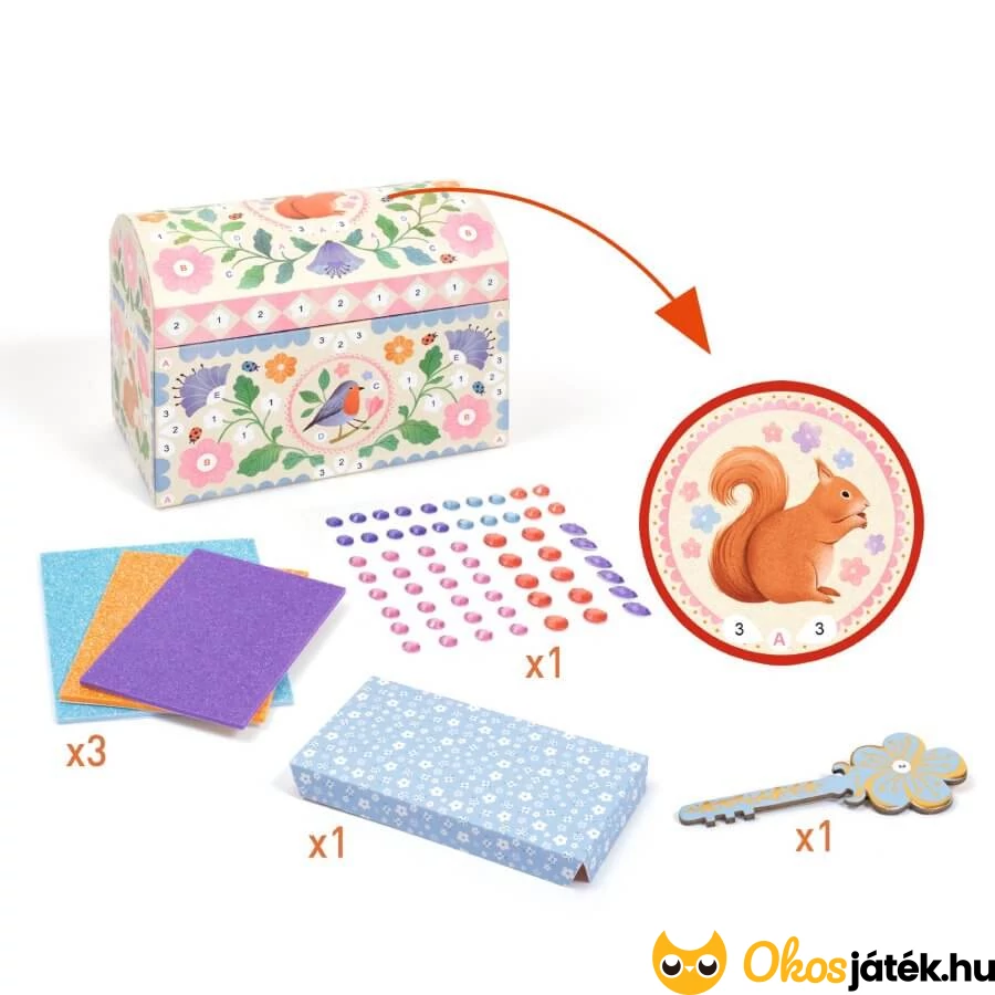 Csináld magad! kreatív kézműves játék, melynek virág és állat mintás ládikóját mozaikokkal, öntapadós strasszkövekkel díszíthetik a gyerekek.