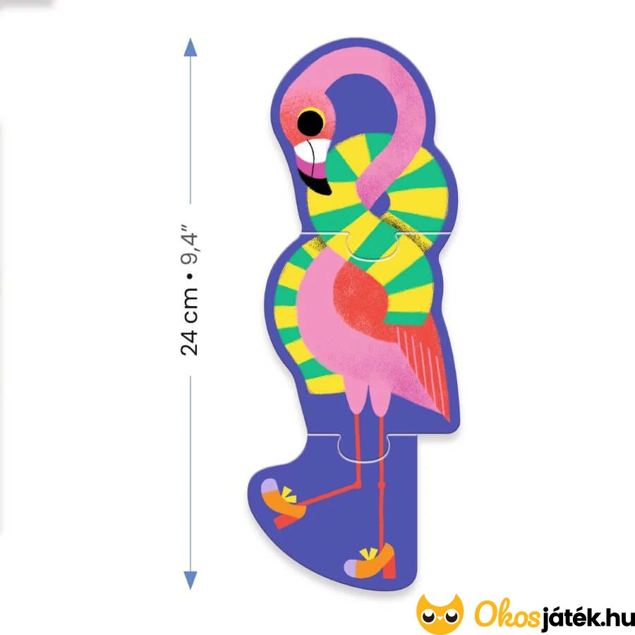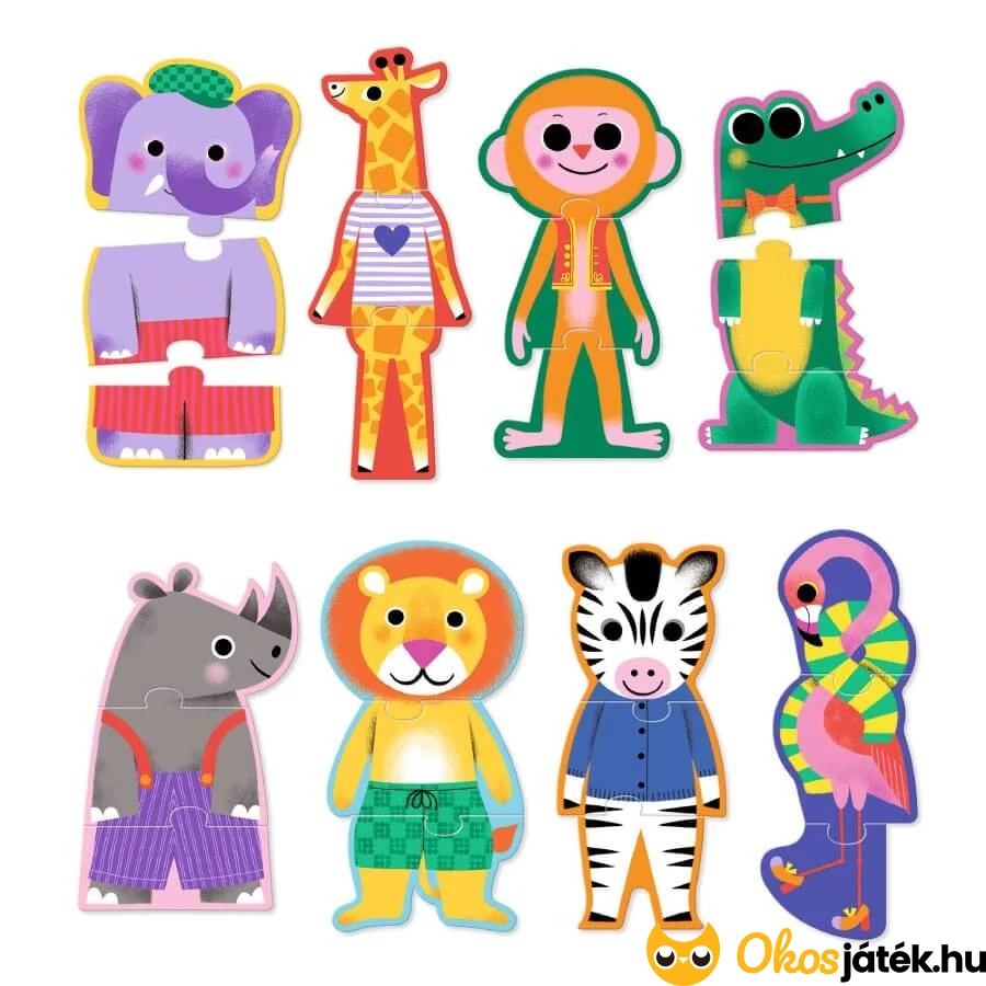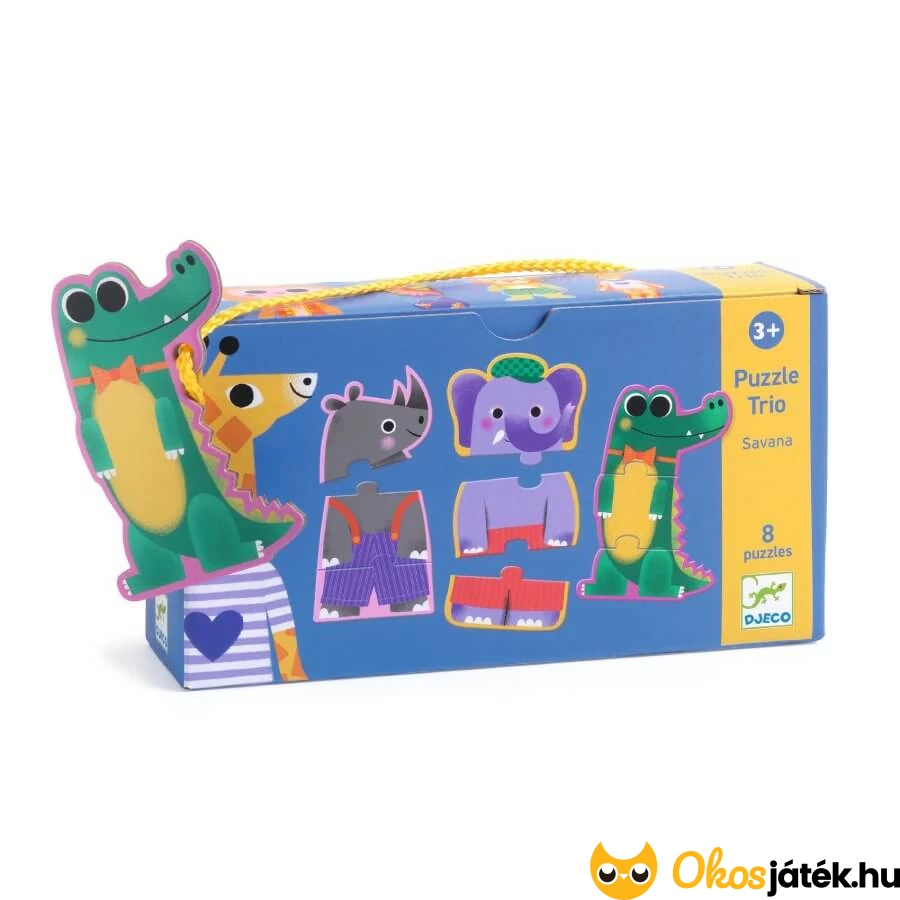 A Djeco kicsiknek készült puzzle készletében 8 szavannai állatot rakhatnak össze a gyerekek, mindegyiket 3 darab, nagy, színes és strapabíró karton darabból.