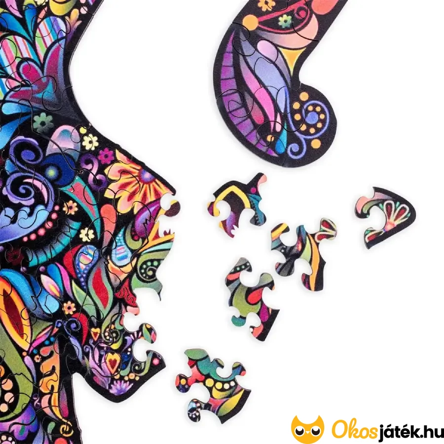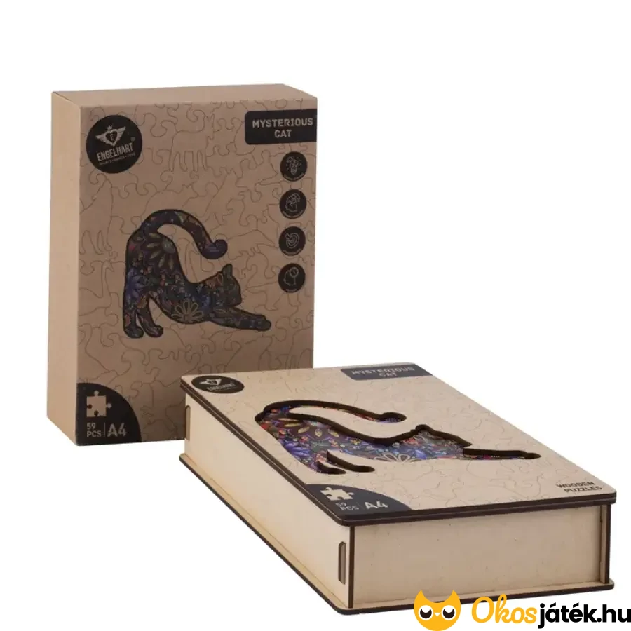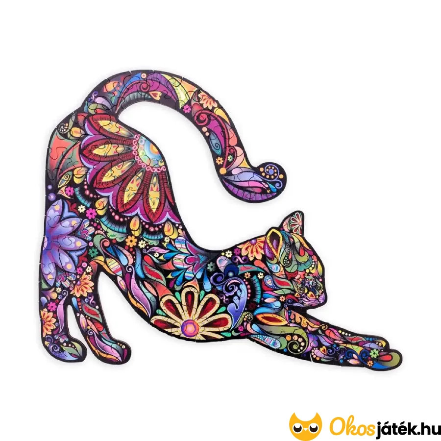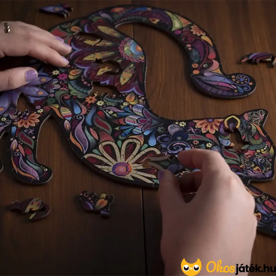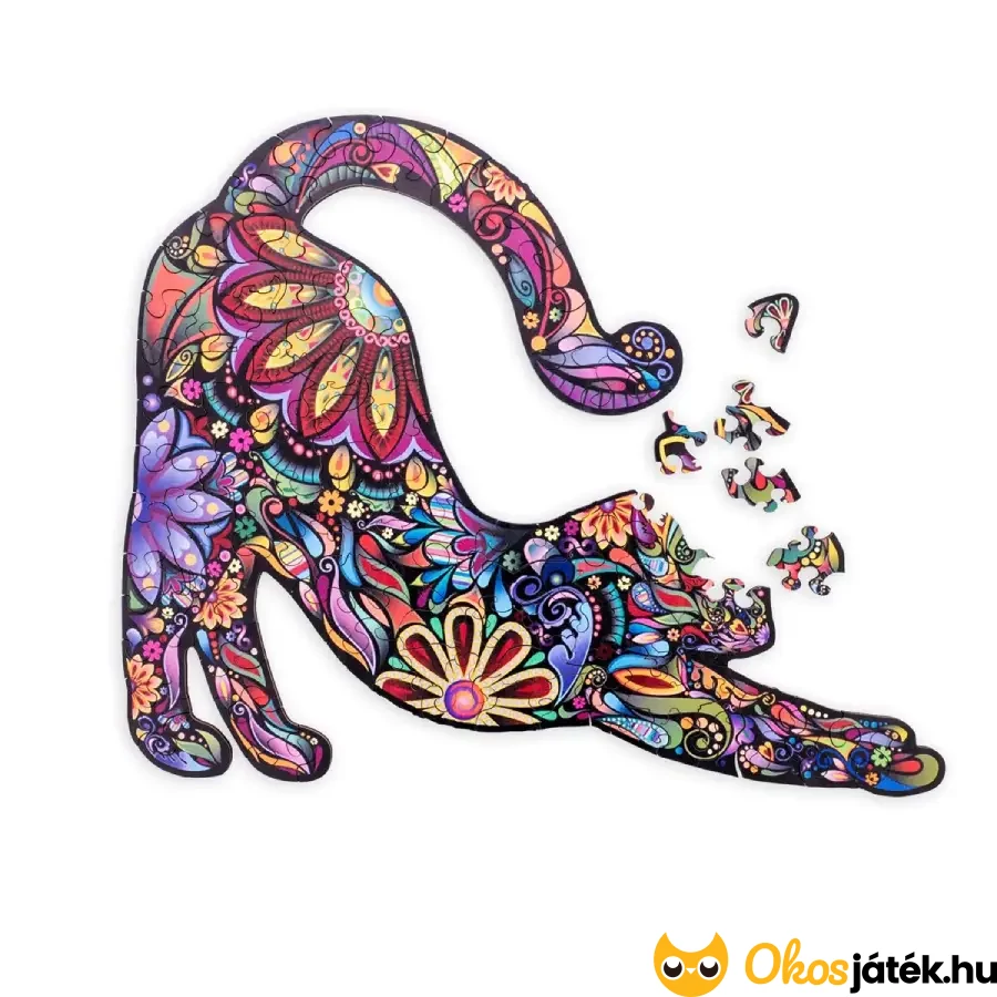 Egyedi, fából készült cicás forma puzzle 12 éves kortól. Nemcsak az idősebb gyerekeknek, de felnőtteknek is tartalmas időtöltést kínál ez a gyönyörűen, aprólékos munkával kidolgozott kirakó.