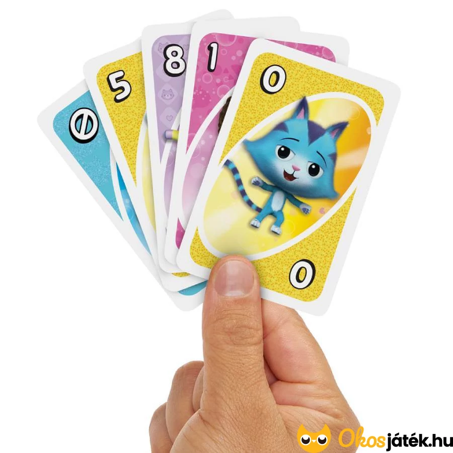 A játék egyszerűsített szabályokkal működik, így már az óvodáskorúak is könnyedén megérthetik. Három nehézségi szinten játszható: az első szinten csak a színek és számok párosítása a feladat, a másodikon már akciókártyák is megjelennek, míg a harmadik szint a teljes UNO-élményt nyújtja a gyerekek kedvenc mesevilágába ágyazva.