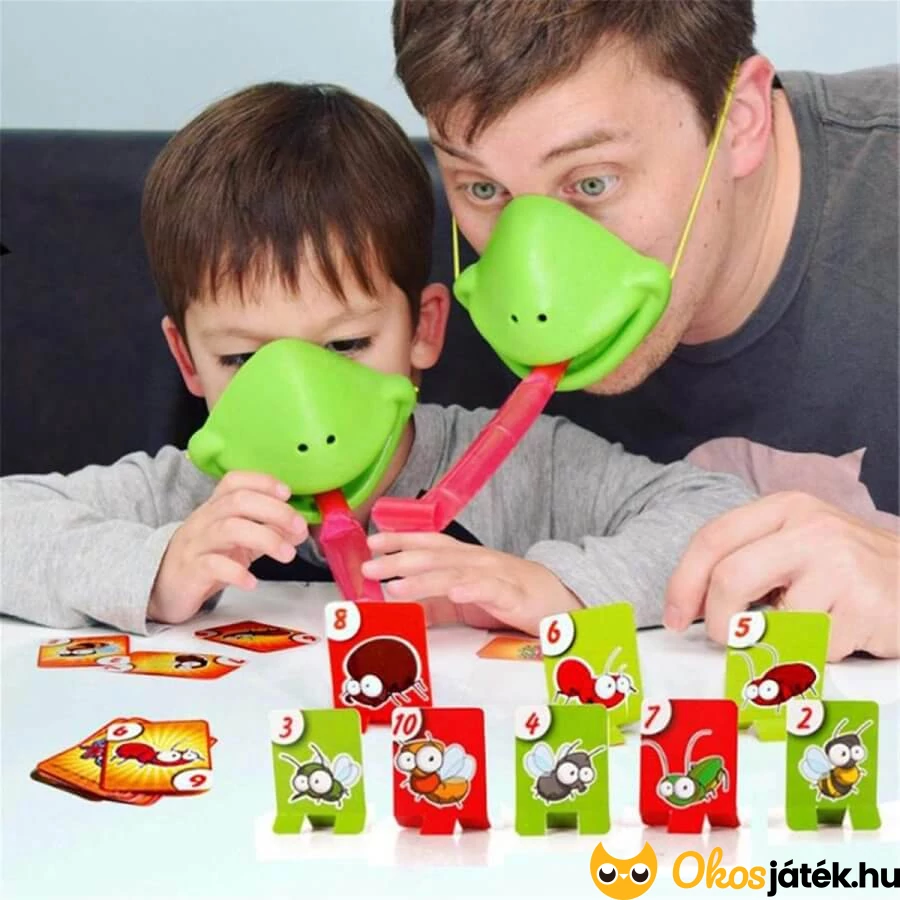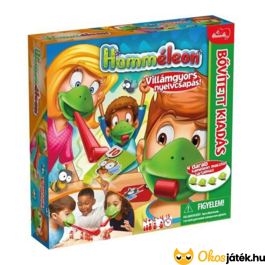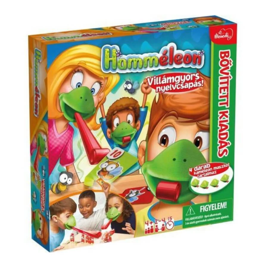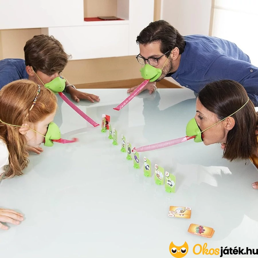 A vicces kaméleon maszkokban lettek elhelyezve az anyósnyelvek, amiket megfújva lehet megcsinálni az ügyességi feladatokat.