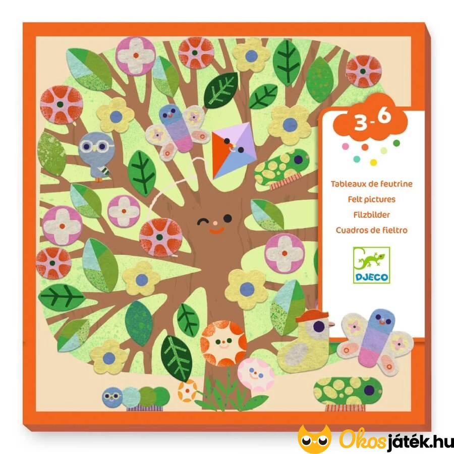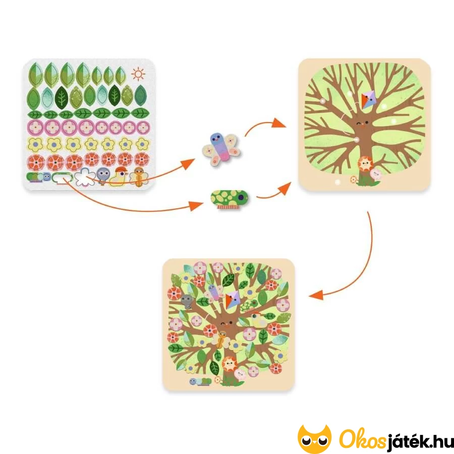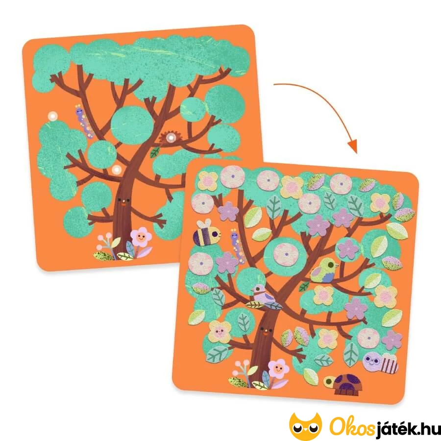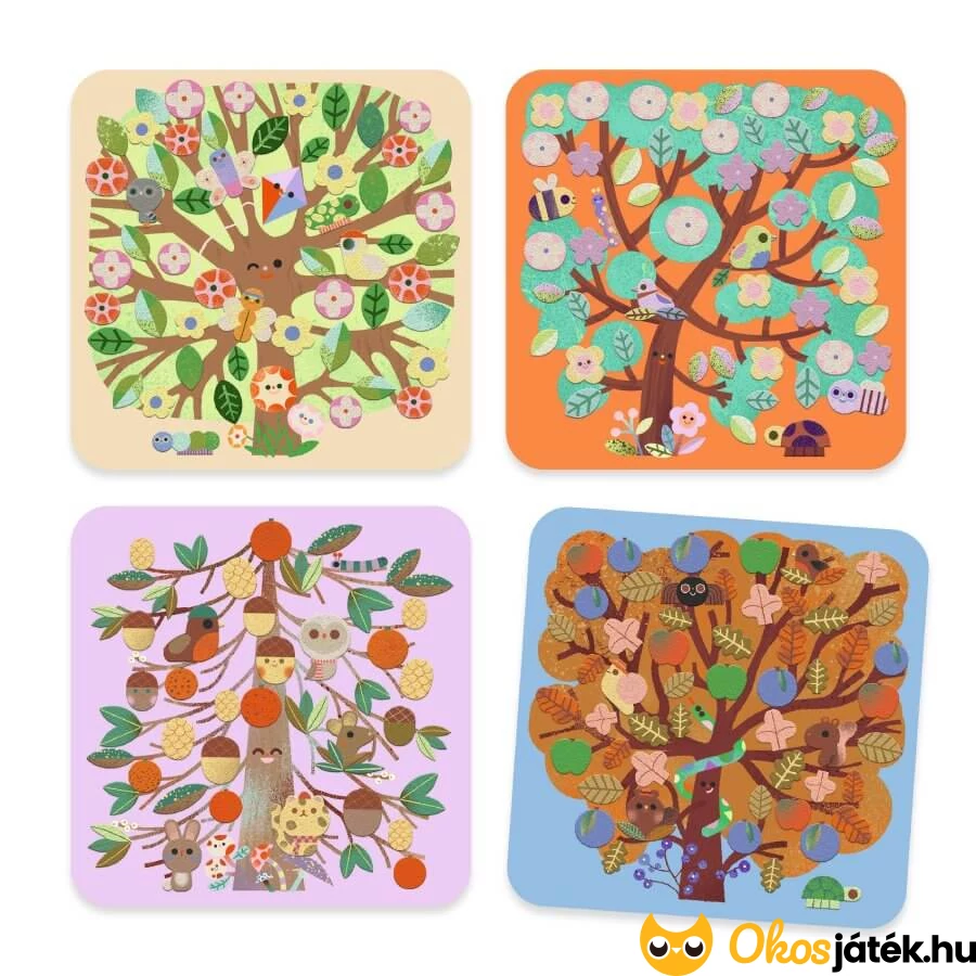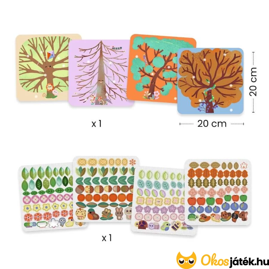 Matricás Djeco kreatív játék, melyben a gyerekek négy fát megjelenítő lapot matricázhatnak fel a filcből készült matricákkal.