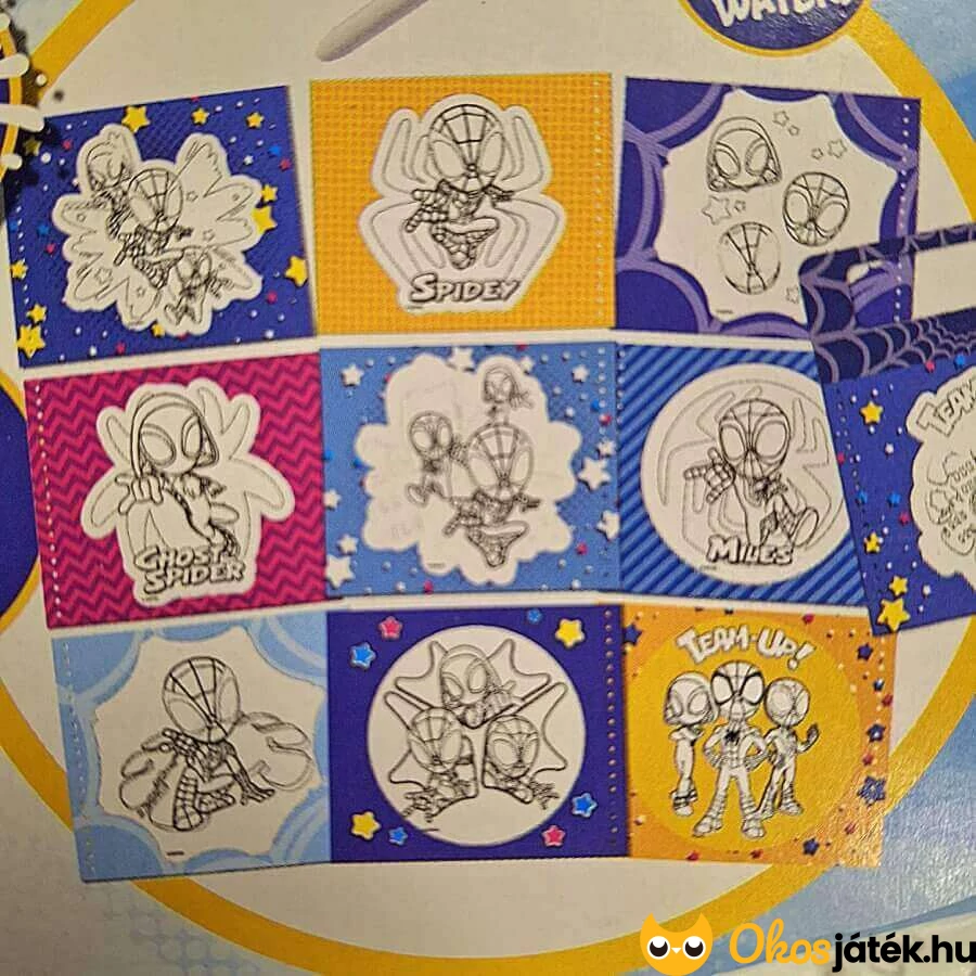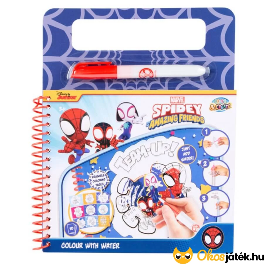 Ez a színező már 3 éves kortól remek kikapcsolódást nyújt a gyerekeknek. Különlegességét az adja, hogy a szetthez tartozó vizes toll segítségével kell a képeket kifesteni. A spirál szerű könyvecskében 10 festhető kép várja a mesehős kedvelőit, hogy a vizes toll segítségével előcsalogassák a színeket. Az ecset és a víz segítségével más és más pókemberes jeleneteket kelthetnek életre a gyerekek. Feltűnik köztük Pókember, Pók-Gwen és Miles Morales is, akikkel a gyerekek nap mint nap találkozhatnak a népszerű animációs sorozatban.