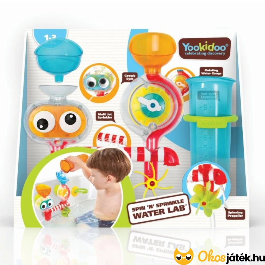 A beöntött víz sok helyen folyhat ki a Yookidoo fürdőjátékból, és útja során pici elemeket mozgat meg, vízimalom kereket, forgó vízmérőt pörget meg.